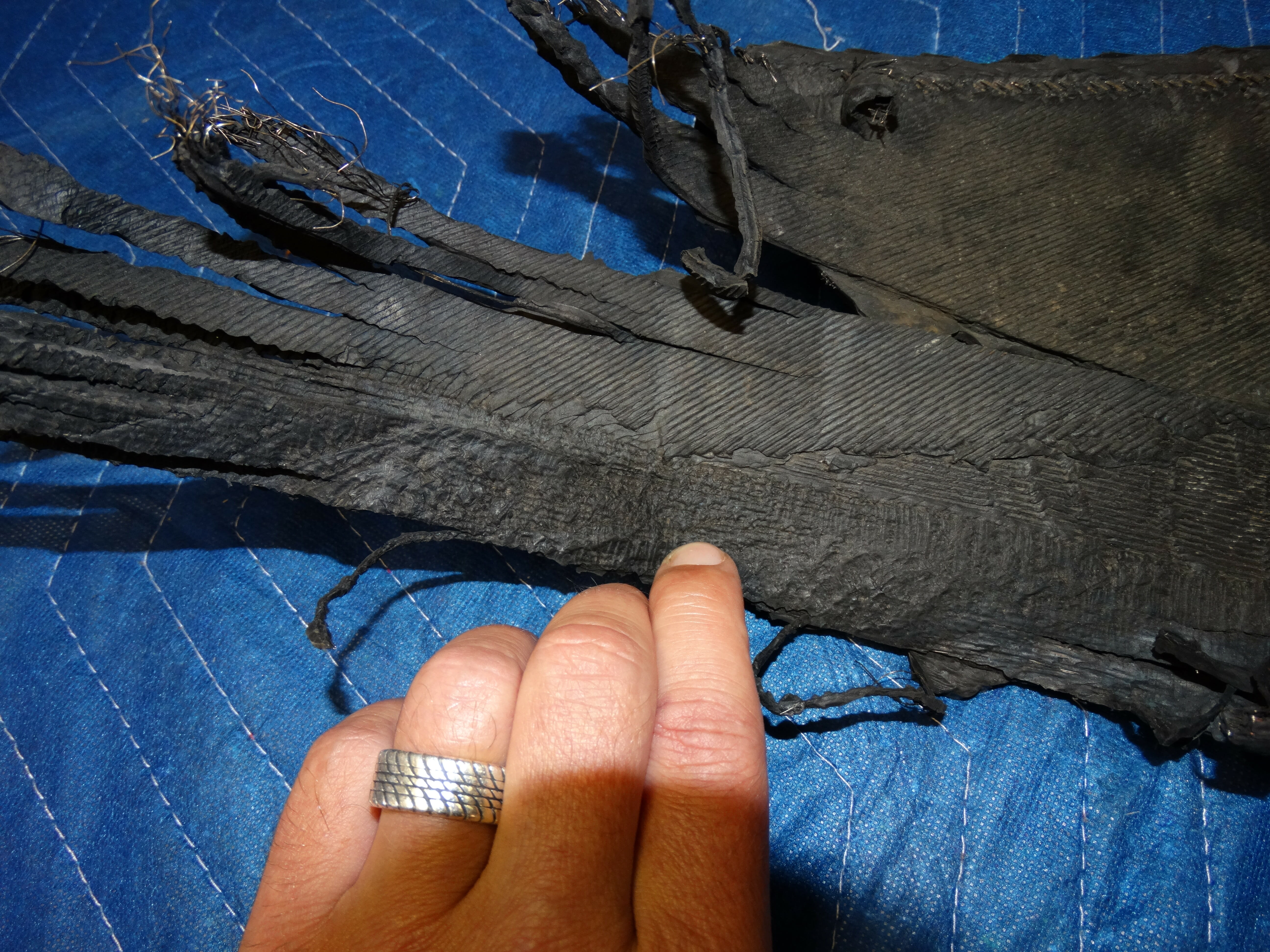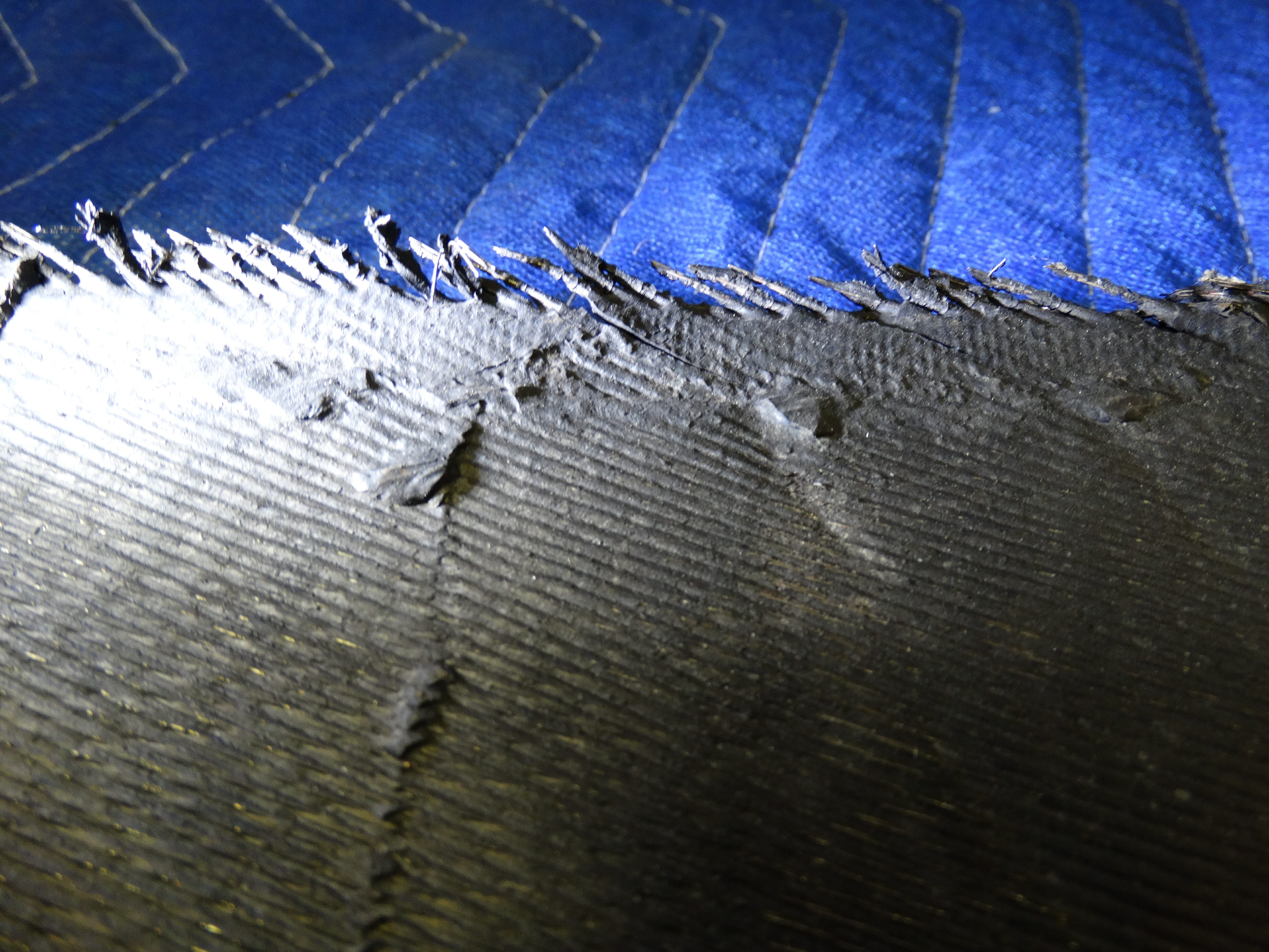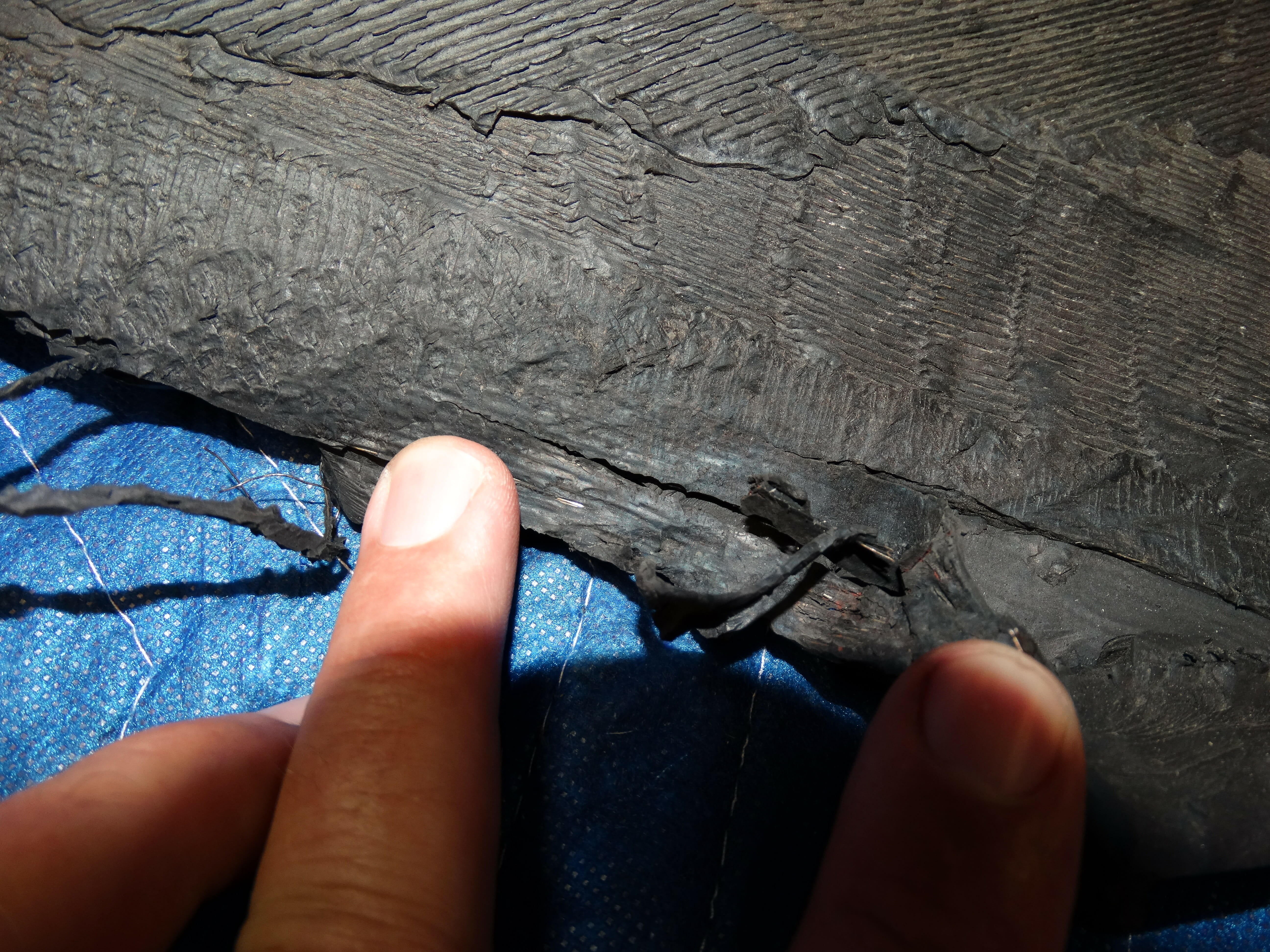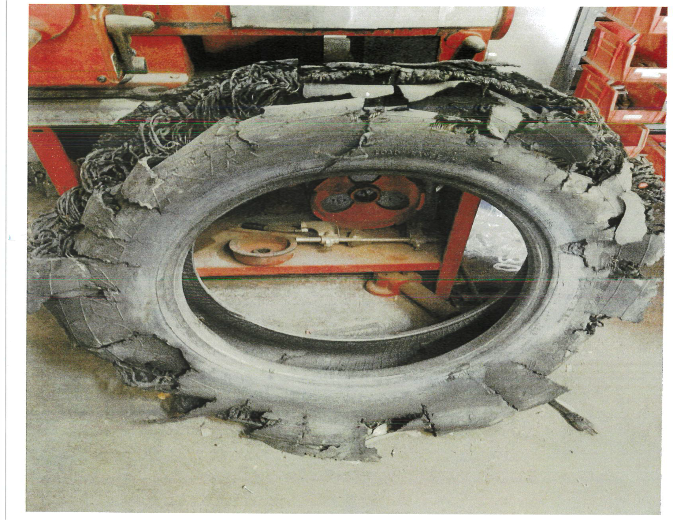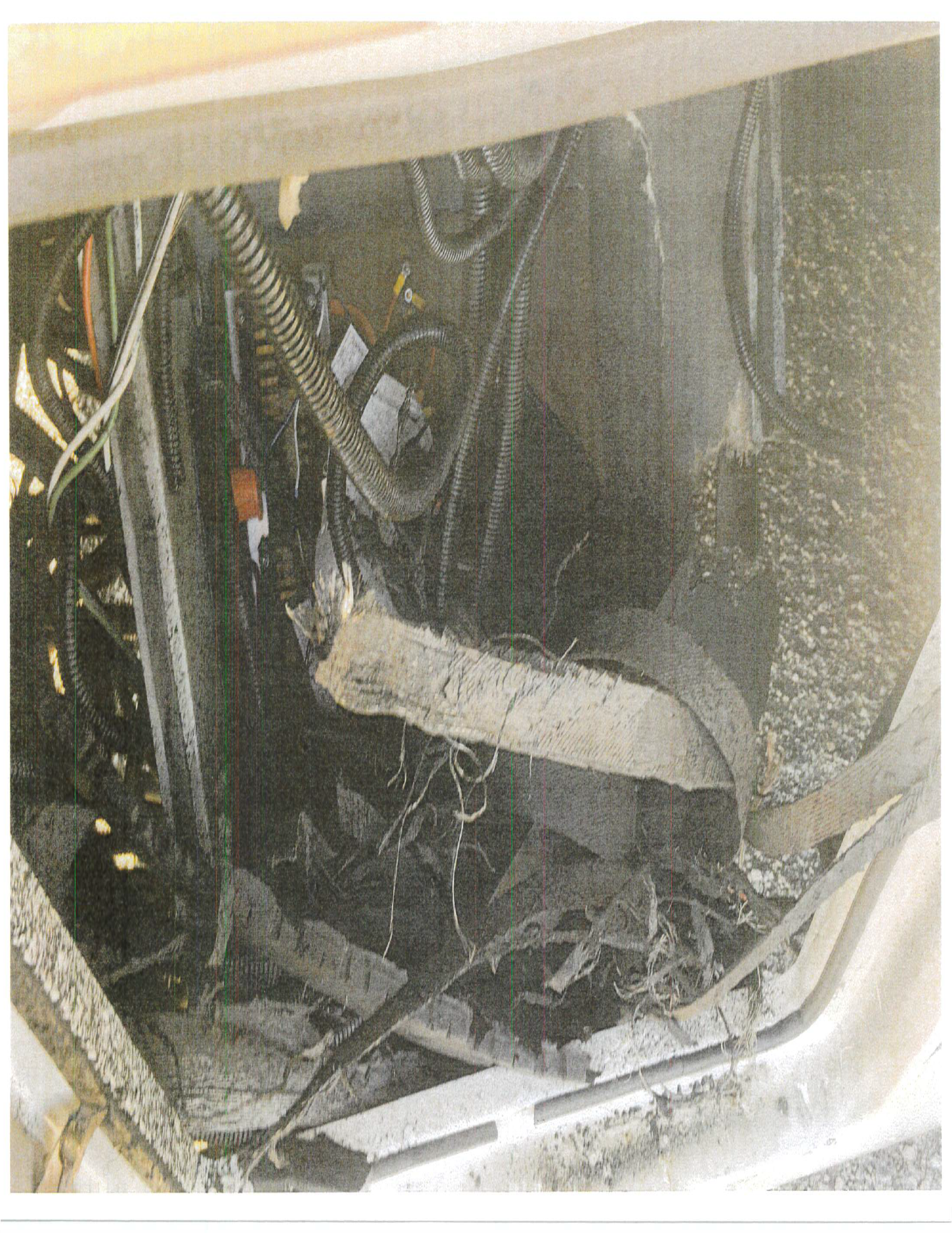 - Closer view of the electrical compartment with tire fragments present and the rearward compartment torn open.